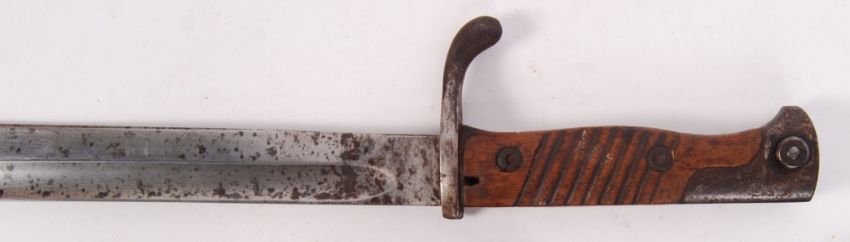 An original WWI First World War German Seiten Gewear MkI 1895 / 05 Butcher Bayonet.  maker mark Simson & Co Suhl present to top of blade. Within the original scabbard. Measures approx 52cm tall.