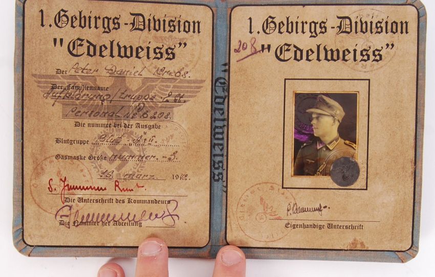 A Nazi German Third Reich army ' 1st / First Mountain Division ' Edelweiss ' ID book. Featuring a photograph, and various hand written sections.  NOTE: From a private collection of German militaria comprising of both genuine and replica items. Where possible we have stated ‘original’ or ‘replica’ but buyers are strictly reminded to satisfy themselves prior to bidding as to authenticity / condition irrespective of the description.