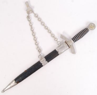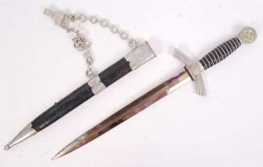 An original WWII Second World War First Pattern German Third Reich Nazi Luftwaffe dress dagger. The blade marked for FW Holler of Solingen. Complete with the aluminium hangar, also marked with makers initials OLC. Within the original and correct scabbard. Measures approx 49cm long.