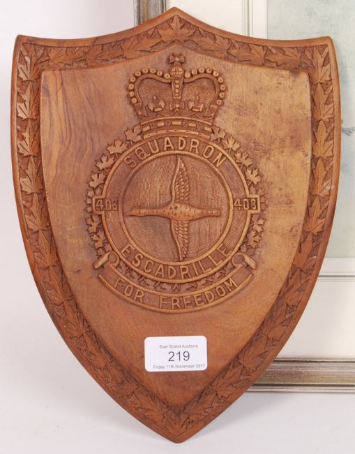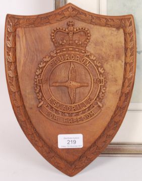 Two WWII Second World war RAF Royal Air Force relating items to include; Squadron Escadrille wooden plaque & watercolour titled ' Lancaster Bombers '  by Frank Cox, 1977. Plaque measures approx 25cm tall & watercolour measures 67cm by 51cm.