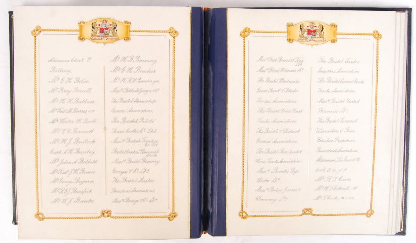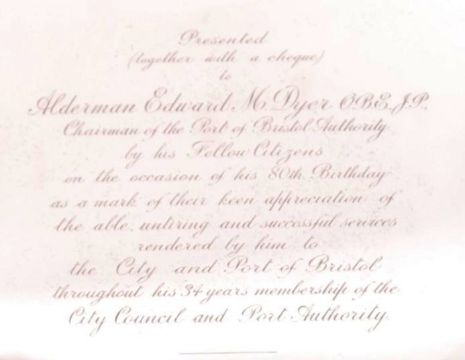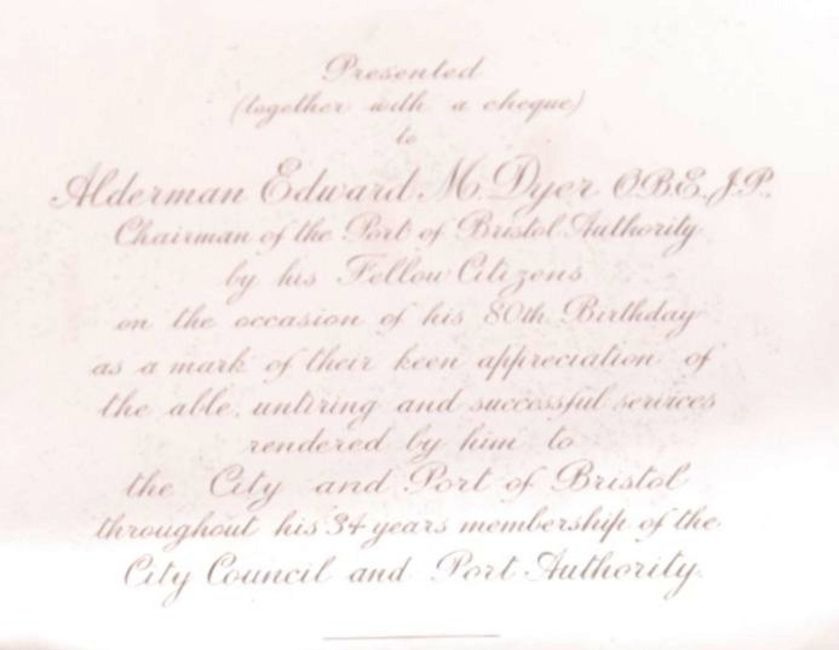 A rare and important collection of Bristol related items, all pertaining to the Lord Mayor Edward Malachi Dyer, OBE. Lord Mayor of Bristol 1926-27 and Chairman Of The Port Authority in 1924. This collection comprising; a solid silver hallmarked presentation salver given to Dyer on his 80th birthday and dated 1936. Engraved with the following notation; 'Alderman Edward M Dyer OBE. JP, Chairman of the Port of Bristol Authority by his fellow citizens on the occasion of his 80th birthday as a mark of their keen appreciation of the able untiring & successful services rendered by him to the City & Port of Bristol throughout his 34 years membership of City Council & Port Authority, 12th December 1936'. Hallmarked for: Walker & Hall, Sheffield, 1935. Measures approx 36cm wide. Weighing approx 1,400g.  Along with the accompanying presentation book, dated 16th December 1936. Fabulously hand painted throughout with scenes of Bristol and various decorations. Title page reading ' This Book contains the names of those citizens of Bristol who have subscribed to the presentation of Alderman Edward M Dyer, OBE, JP, Chairman Port Of Bristol Authority, of an inscribed silver salver and a cheque in recognition of his great services to the City & Port of Bristol during the past 34 years.' The book containing all hand signed signatures of those present, including the Lord Mayor, Sheriff of Bristol and others.  Also present, is the original presentation cheque awarded to Dyer for the sum of Two Thousand Guineas. Also beautifully hand painted and inscribed. This collection also features Dyer's official declaration granting him the role of Mayor Of Bristol, and a photograph of Dyer in mayoral regalia.