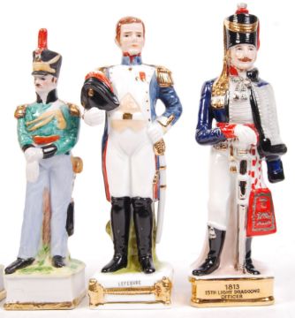 A collection of 5x Capodimonte style napoleonic porcelain figures to include; Lefebvre, 1813 15th Light Dragoons Officer, Lannes, & others. All measuring approx 23cm tall.