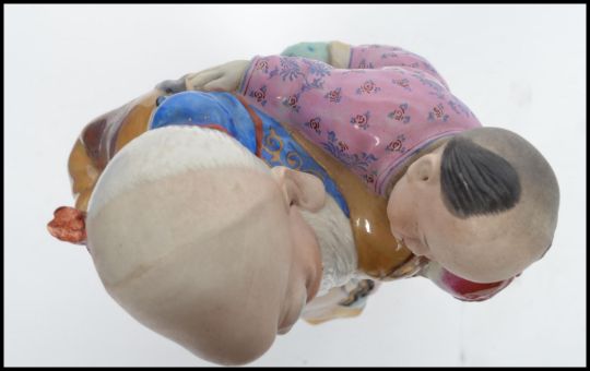 An Oriental Chinese Ceramic figurine of an elder with a large head carrying a child eating a large peach, the robed elder holding a staff. Measures 32 cm high, 16 cm wide and 14 cm deep.