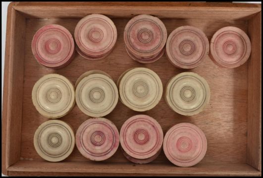 A 19th century ivory drafts set comprising stained red and natural pieces. 15 red pieces, 9 natural. Each piece measuring just over 3.5cms each.