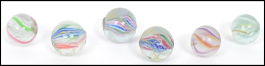 A group of nine 19th century Victorian latticino swirl ribbon air twist marbles having pontil marks.