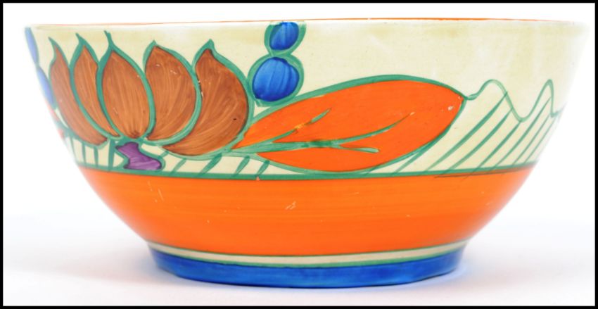 A Clarice Cliff ' Fantastique ' in the Lily pattern ( 1929 ) bowl by Wilkinson Ltd circa 1930's, decorated with colourful hand painted floral panel with orange and green banding to interior, signed to the base. Measures 10 cm high and 22 cm diameter.