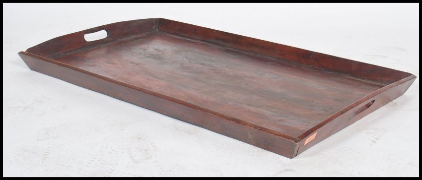 A very large 19th century Victorian butlers tray having a raised edge with pierced handles. Measures: 6cm high x 101cm wide x 59cm deep.