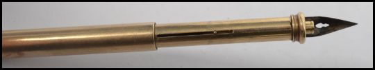An early 20th century yellow metal tests as 9ct gold propelling pencil and pen compendium with pull out and sliding sections and bail hoop atop. Weighs 14.2 grams.