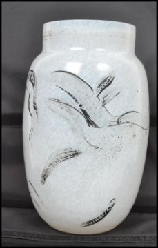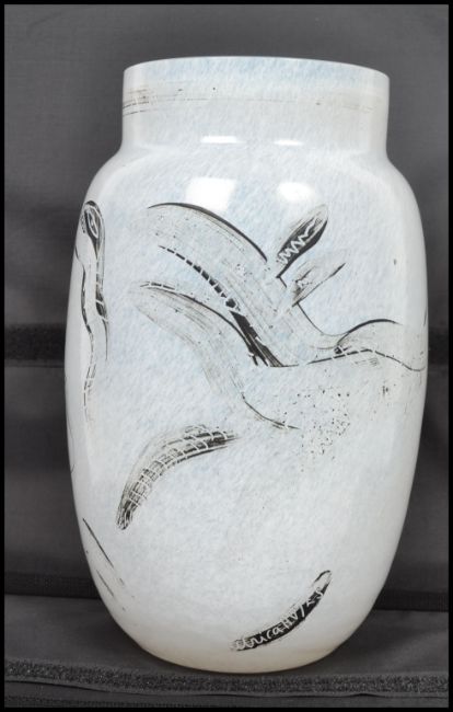 A vintage 20th century Kosta Boda studio glass face vase having a painted face design with etched number to base 48734 by Ulrica Hydman Vallien. Measures 21 cm high and 12 cm diameter.