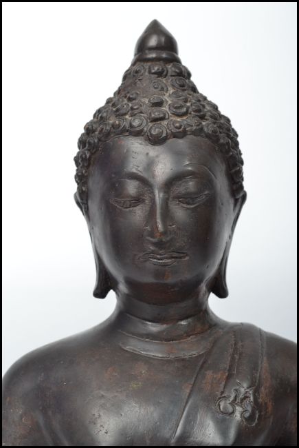 A believed 19th century Chinese bronze hollow cast figure - sculpture of a Buddha - deity in the lotus position and on raised pedestal base. Measures 39 x 25 x 12cm.