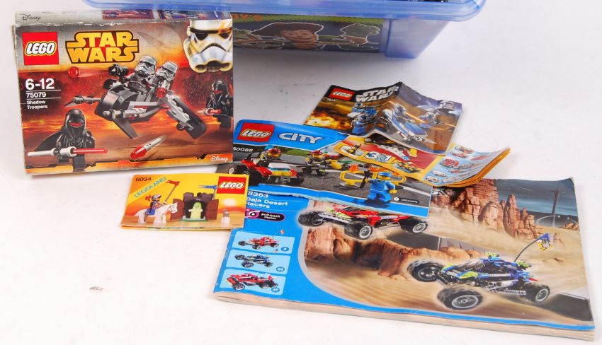 A large quantity of assorted loose Lego, to include; City, Star Wars, Creator, Racers and other pieces. Along with a boxed Star Wars 75079 set and various instruction manuals. Approx 5kg in total.