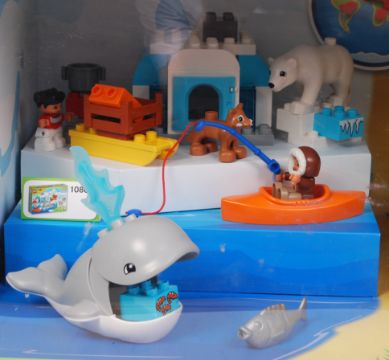 A Lego point of sale shop display advertising cabinet for the Duplo series. Featuring sets 10802 and 10803. Fully assembled for display. Measures approx; 39cm x 59cm x 38cm