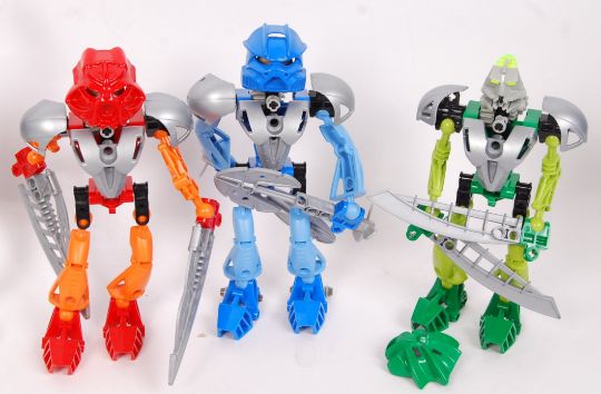 A set of 6x Lego Bionicle Toa Nuva assembled figures to include; 8566 Onua Nuva, 8567 Lewa Nuva, 8568 Pohatu Nuva, 8570 Gali Nuva, 8571 Kopaka Nuva & 8572 Tahu Nuva. All appear complete with original instruction manuals.