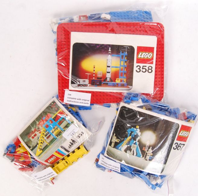 A collection of 3x early vintage Lego sets. To include; Lego 358 Rocket Base, 367 Moon Landing and 351 Loader Hopper. All have been checked by vendor who assures us they are 100% complete (unchecked by us). All loose bagged, with instructions.