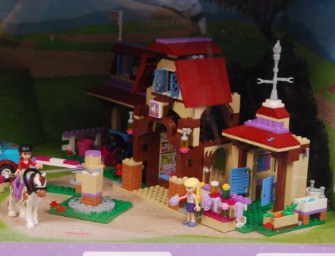 A Lego point of sale shop display advertising cabinet for Lego Friends. Featuring sets 41125 Horse Vet & Trailer, 41123 Foal's Washing Station and 41126 Heartlake Riding Club. Fully made and assembled for display. The cabinet with lights in fully working order. Measures approx; 39cm x 59cm x 38cm.
