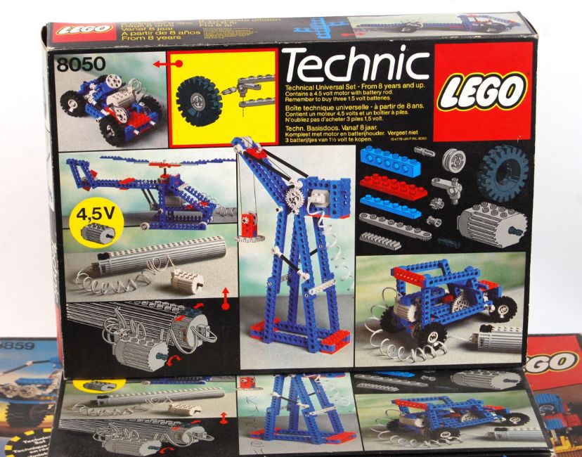 A good collection of 4x vintage early Lego Technics sets. To include 2x 8050 'Universal Building Set', 8859 Tractor, and 8860 Car Chassis. Vendor has checked parts and assures us sets are complete, HOWEVER the contents are mixed between the boxes and may not match the set featured in each box. Requires sorting.