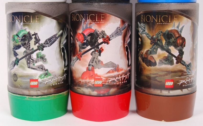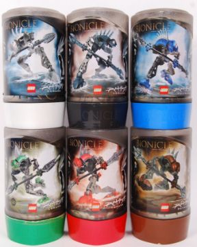 A set of 6x Lego Bionicle Rahkshi collection canned sets to include; 8587 Panrahk, 8592 Turahk, 8589 Lerahk, 8588 Kurahk, 8591 Vorahk & 8590 Guurahk. All appear complete within their original cans with instruction manuals.
