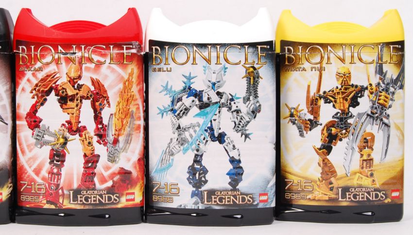 A set of 6x Lego Bionicle ' Glatorian Legends ' collection plastic cased characters to include; 8988 Gelu, 8986 Vastus, 8984 Stronius, 8985 Ackar, 8987 Kiina & 8989 Mata Nui. All within their original plastic case with contents separated into bag with instruction manuals. All appear complete.