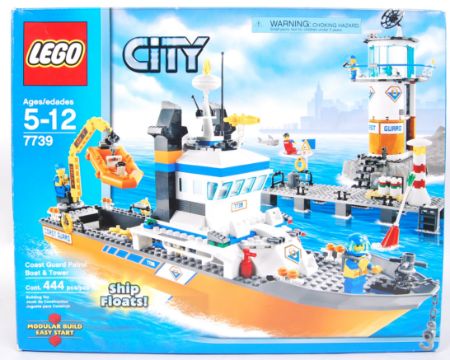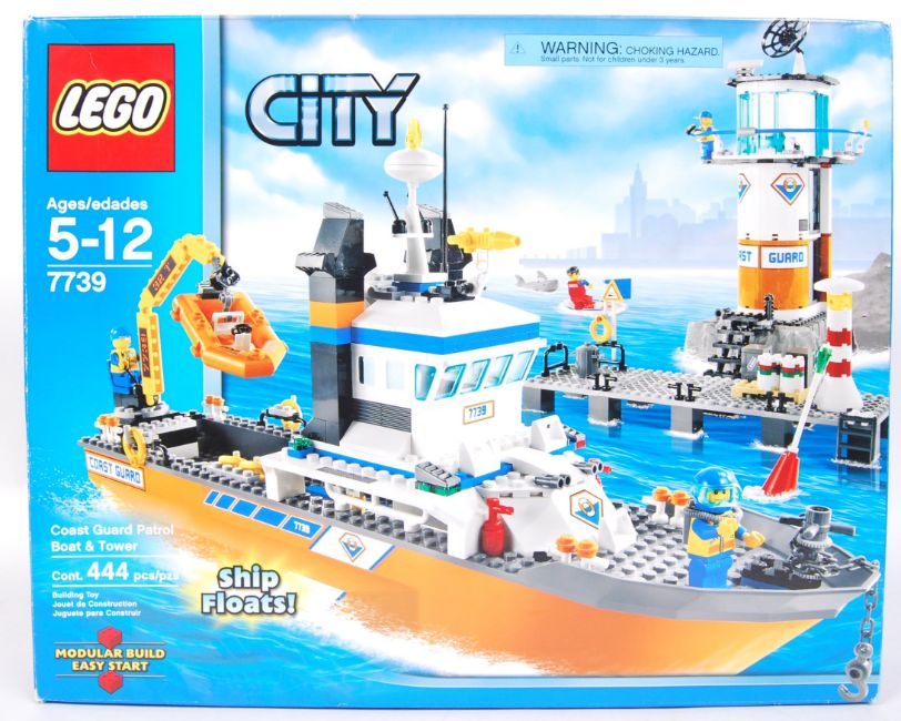 A Lego City set 7739 ' Coastguard Patrol Boat & Tower '. Vendor assures us set is complete (no stickers for boat) with both instruction manuals. Within the original box. Unchecked by us. (box resealed by vendor).
