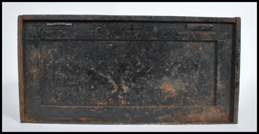 A 19th century heavy cast iron strong box, panelled sides, brass drop swag carry handles to ends, key hole to top hinged lid.
