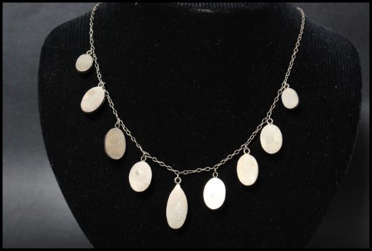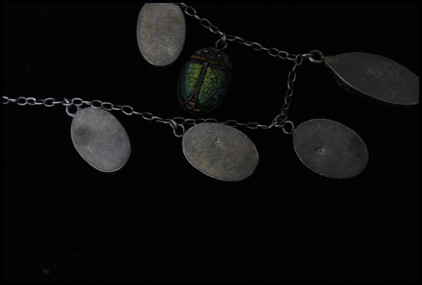 A silver and micromosaic micro mosaic necklace having graduating scarab beetle drops with bolt ring clasp. Stamped 800 to verso.