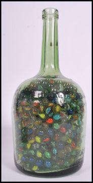 A large collection of vintage 20th century glass marbles contained within a large glass bottle containing various designs and colours.