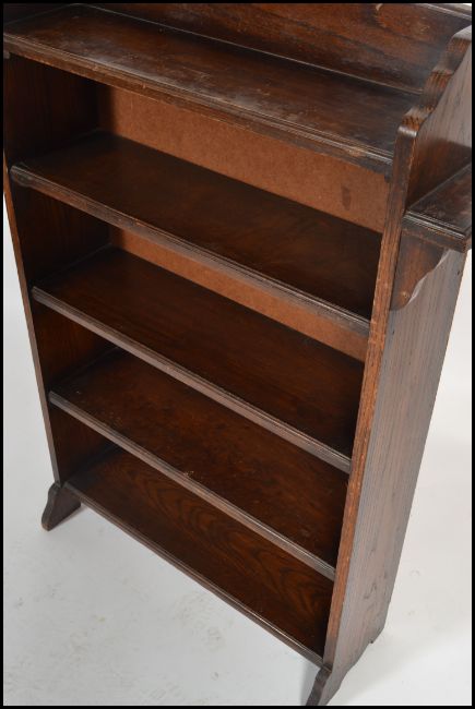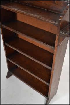A 1900's Arts & Crafts oak peg jointed open window bookcase cabinet having fixed bank of shelves with a stage gallery back