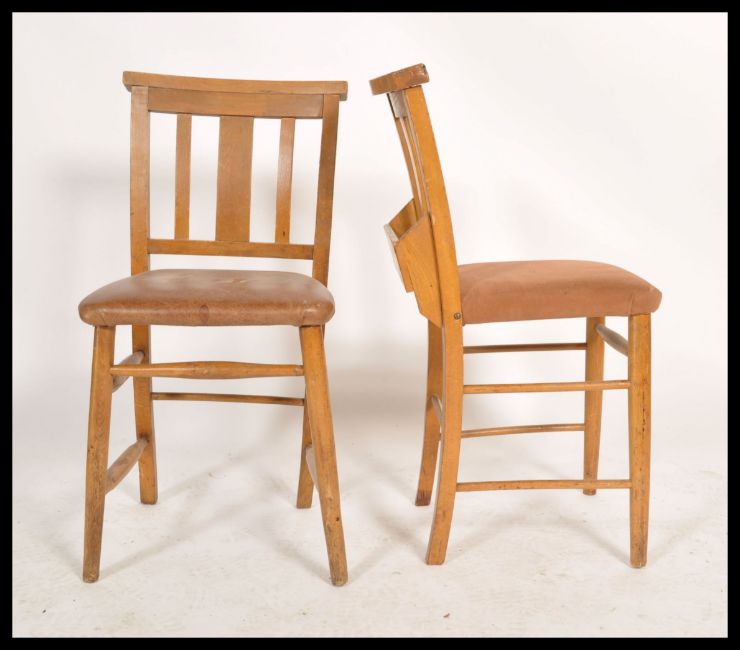 A set of 4 20th century beech wood chapel chairs being raised on turned legs with overstuffed seats,2 in leather. Above flat top rails with book troughs rear. Measures 88cm x 36cm.