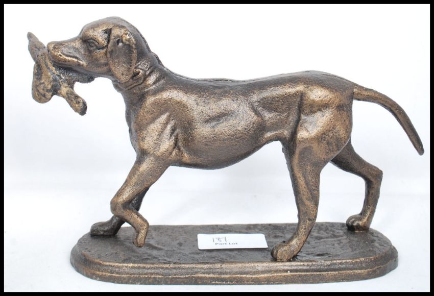 A collection of three cast metal bronze effect figurines of dogs to include a bitch and a dog greyhound and a retriever with a pheasant in its mouth, all raised on plinth bases. Highest measures 17 cm.
