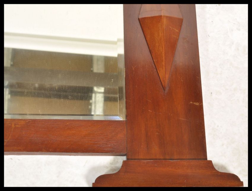 A Victorian mahogany overmantel wall mirror in the Arts & Crafts manner. The central bevelled mirror with shaped panel sides and shelf atop, embellished with diamond lozenges. Measures 79cm x 46cm x 43cm.