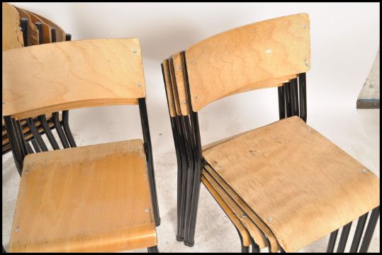 A collection of 13 retro panel wood and tubular metal stacking chairs. Each on ebonised tubular metal frames being marked to underside for Stride Furniture