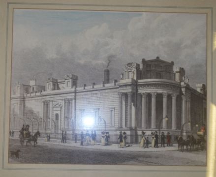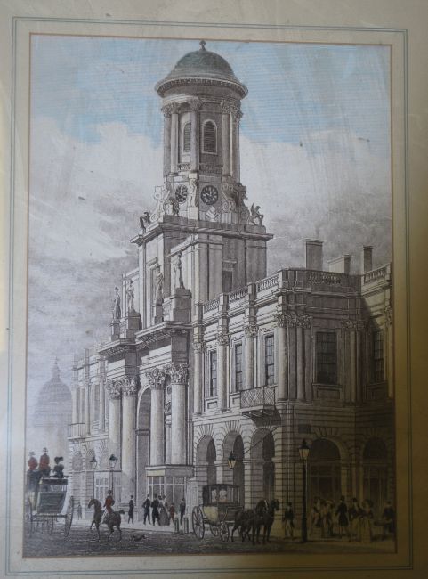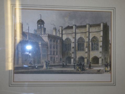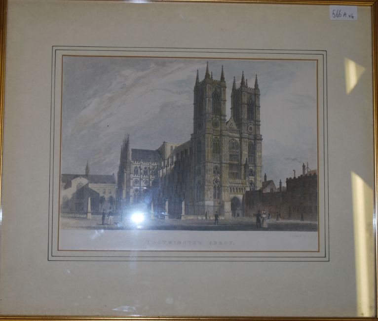 A group of six framed and glazed 19th century style architectural etchings / plates of famous landmarks. Coloured plates to include The corn Exchange, Stock Exchange, Lincolns Inn Hall, Westminster Abbey etc