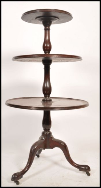 A 19th century Georgian mahogany three tier graduated buffet / dumb waiter, the two bottom tiers revolving, raised on a turned and fluted column tripod base. Measures 112cm x 60cm.