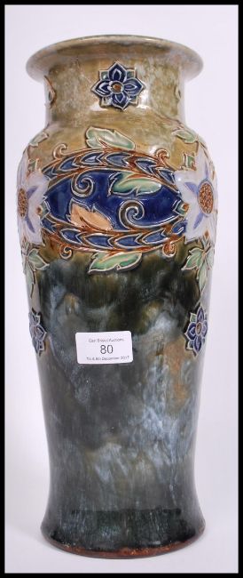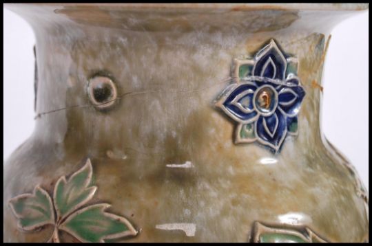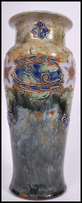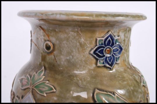 A tall Royal Doulton vase ( A/F ) with an earlier repair to rim, with poly-chrome tube lined floral decoration and monogrammed EB to base H36cm