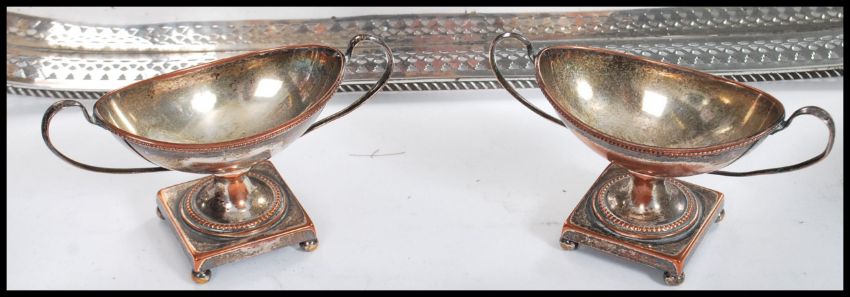 A collection of silver plated items to include a selection of Ivory / bone handled flatware such as a Stilton spoon, toasting fork, pickle forks etc. Together with a silver fret pierced gallery tray, silver plated fret pierced wine coaster and a nickel plated ice bucket.