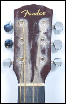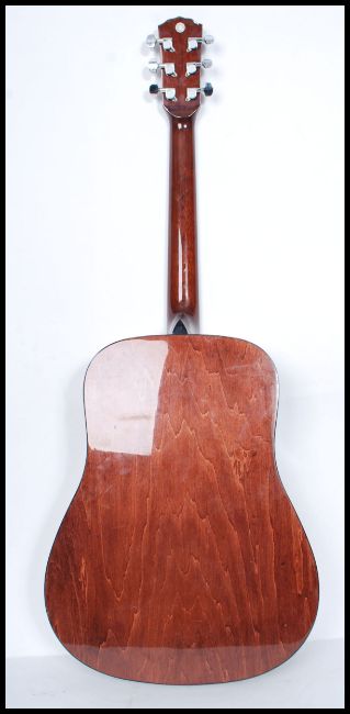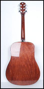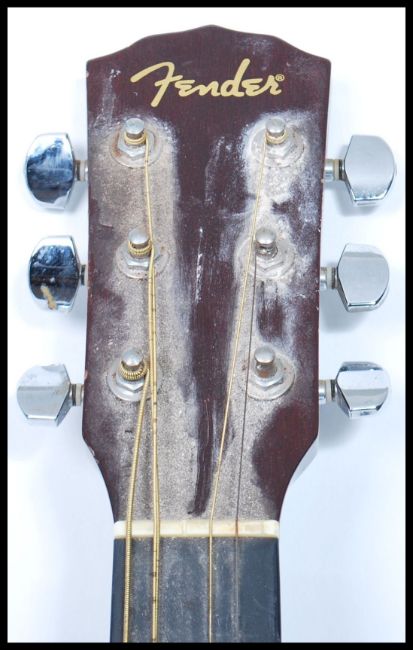 A vintage 20th century Fender BG-5nat acoustic six string guitar. The shaped hollow body having a black scratch guard and mother of pearl fret markers. Serial number CS06107519.