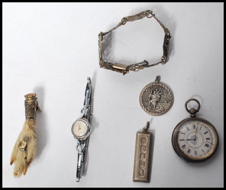 A group of vintage jewellery and watches to include a hallmarked silver Scottish taxidermy claw brooch with two citrine stones and pin to verso, a silver hallmarked 1977 ingot pendant, a silver hallmarked St Christopher's Pendant, a continental silver pocket watch a filigree bracelet and a cocktail watch.