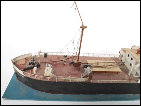 A vintage 20th century scratch built model of a coastal tanker raised on a water effect rectangular display base.