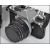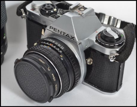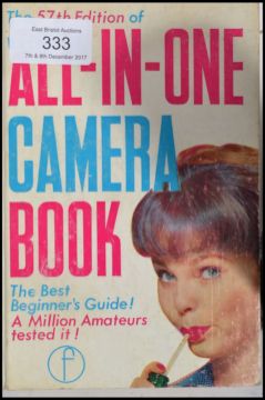 A vintage 20th century Pentax camera with a Sirus lens and flash along with an All in one camera book.