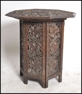 A 19th century black forest carved oak folding table of Octagonal form having carved leaf design to the top with stunning pierced folding base