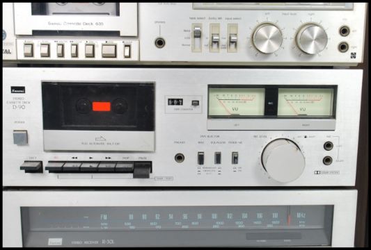 A retro harlequin 20th century stacking system in chrome finish consisting of a Sansui R - 30L stereo receiver, Sansui C - 90 cassette deck, Panasonic cassette deck and a Technics SL - RD33 record deck with a pair of speakers.