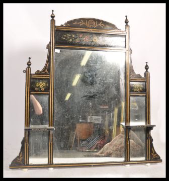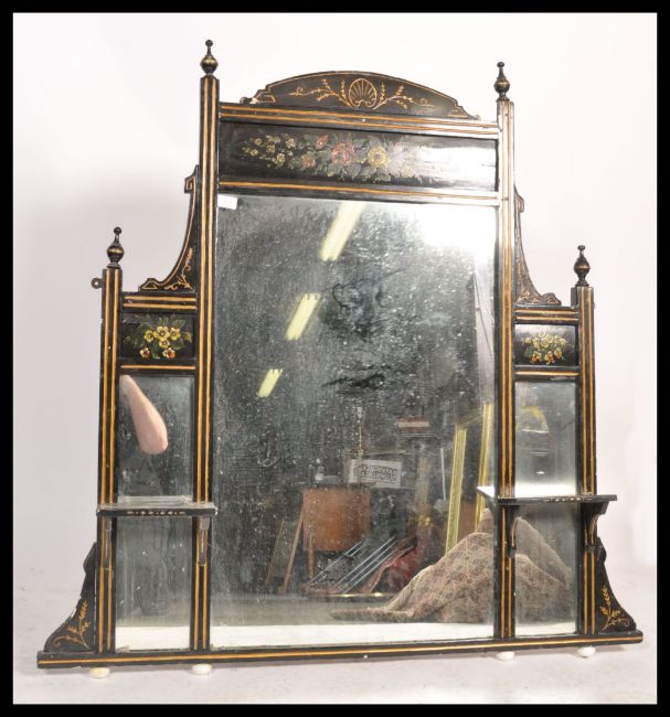 A large 19th century Victorian Aesthetic movement over mantel mirror having an ebonised ground with painted floral sprays. Raised on ceramic bun feet with gilt detailing.