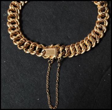 An 18ct carat gold ladies vintage bracelet chain having a fancy engraved link design with hidden clasp and safety chain. Weighs 7.1 grams.