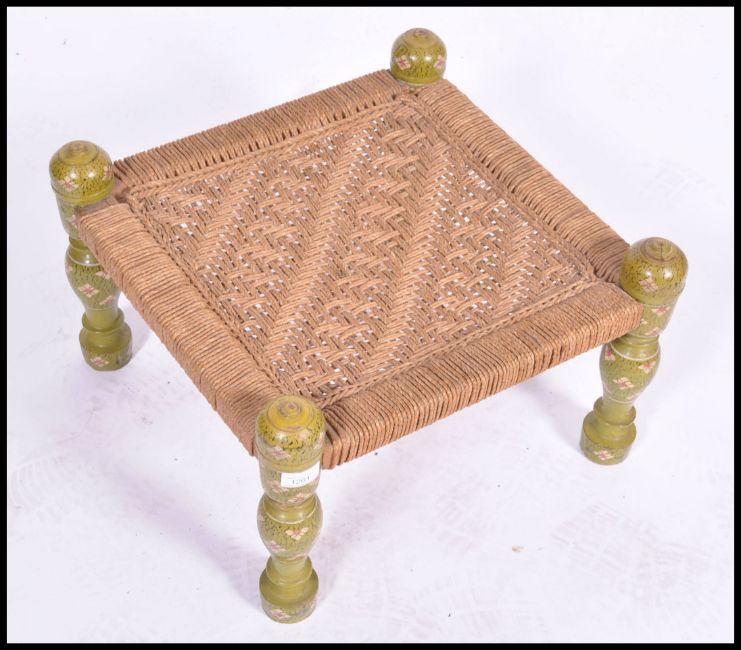 An early 20th century middle eastern Pakistani wooden foot stool of square form having a painted finish with rattan weave seat.