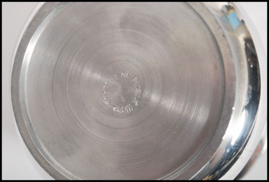 A mid 20th century retro Picquot ware stainless steel  and wooden tea service complete with original tray and coffee pot,tea pot, sugar bowl and creamer