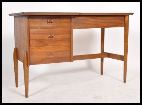 A retro 20th century  Danish teak wood single pedestal desk with an arrangement of three drawers on shaped tapering legs in the manner of Domino Mobler. Measures 76cm x 120cm x 58cm.