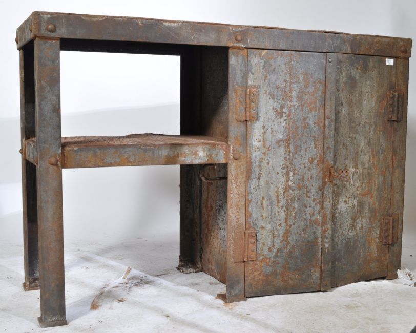 A stunning mid century heavy metal engineers workbench - console sideboard having cast metal framework with metal twin door cupboard, wooden bench top with shelf to the side