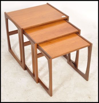 A G-Plan retro teak wood 1970's graduating nest of tables in the Quadrille pattern. The tables having angular legs united by reverse stretchers with graduating table tops above. 49cms High x 53cms wide x 43cms Depth