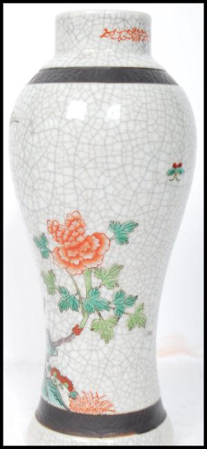 A 19th century crackle glaze Chinese Oriental vase depicting birds of paradise. The vase of waisted form having a circular rim with black character marks to base. Measures 27cm high.