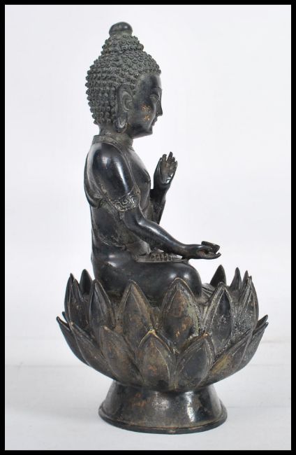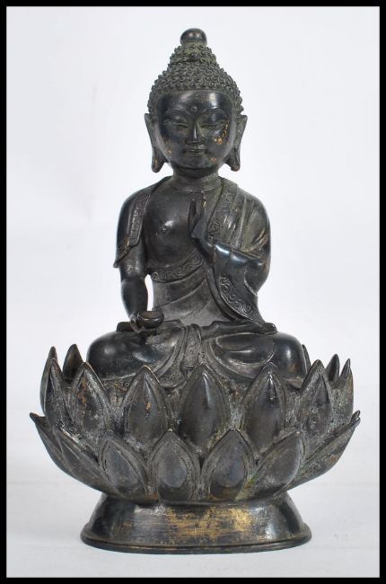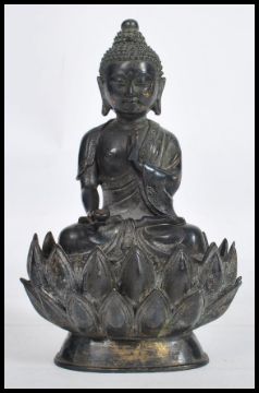 A 19th century Oriental Chinese bronze Buddha modelled in the lotus position raised on a pedestal base in the form of a lotus flower. Measures 22cm high.
